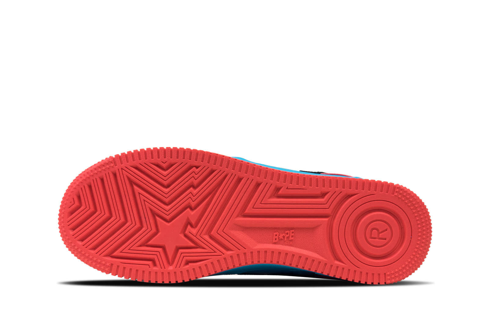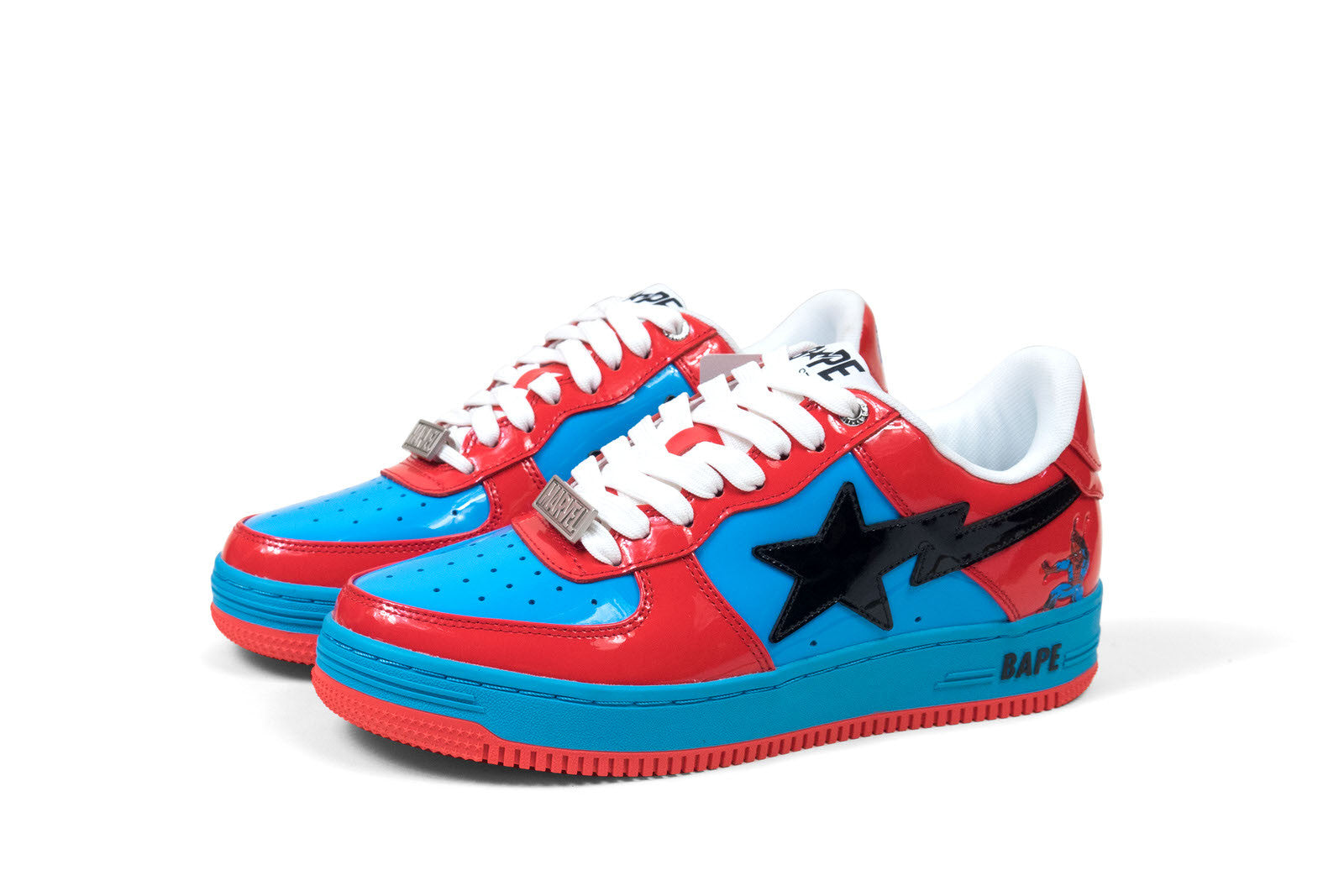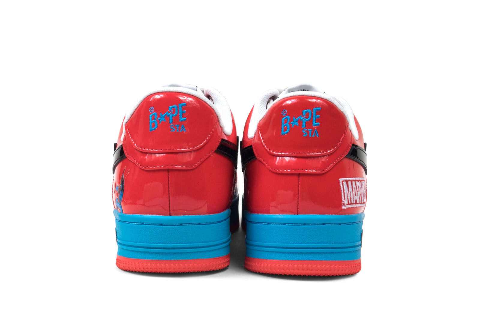 This BAPE STA sneaker features a Spider-Man-themed upper made of patent leather with a blue base and red overlays on the heel, eyestays, and forefoot panel.